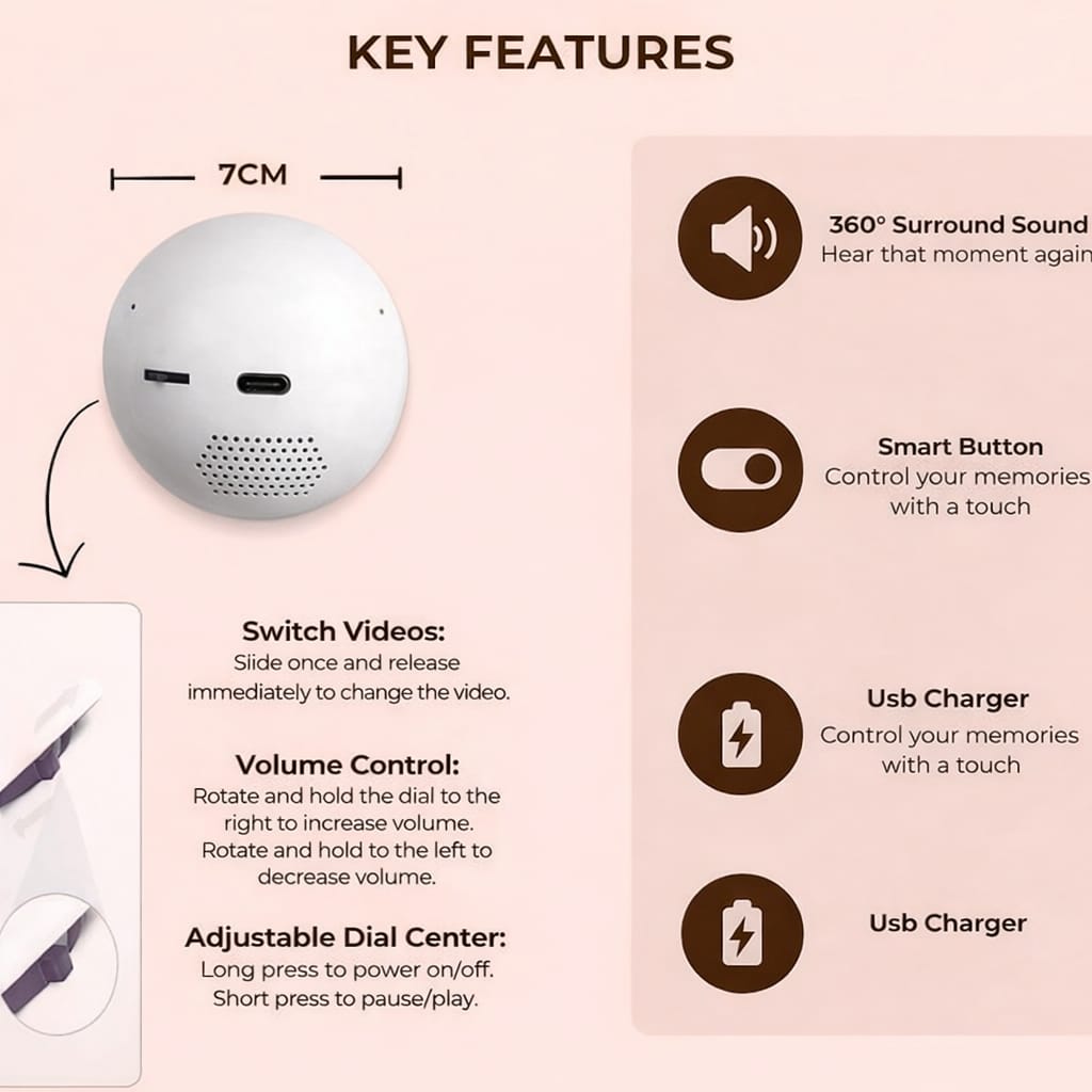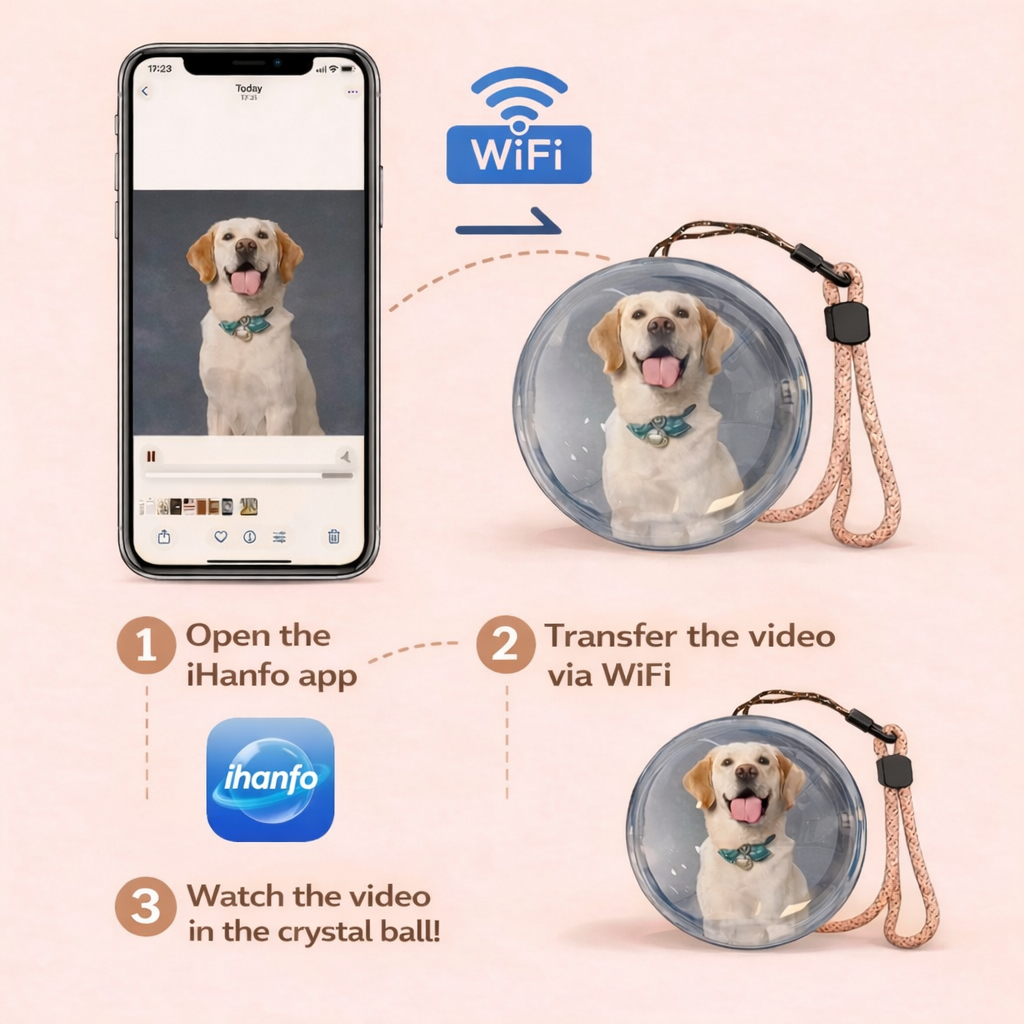 Transfer your photos and videos wirelessly — no cables, no computer, no stress. Just connect to your Glowy Orb’s Wi-Fi, open the IHANFO app, and upload your memories in seconds. Beautiful moments, displayed effortlessly. Simple. Fast. Magical!